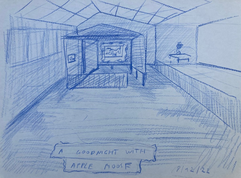 A good night with apple moose, 21cm x 29,7cm, blue pencil on paper, 2022