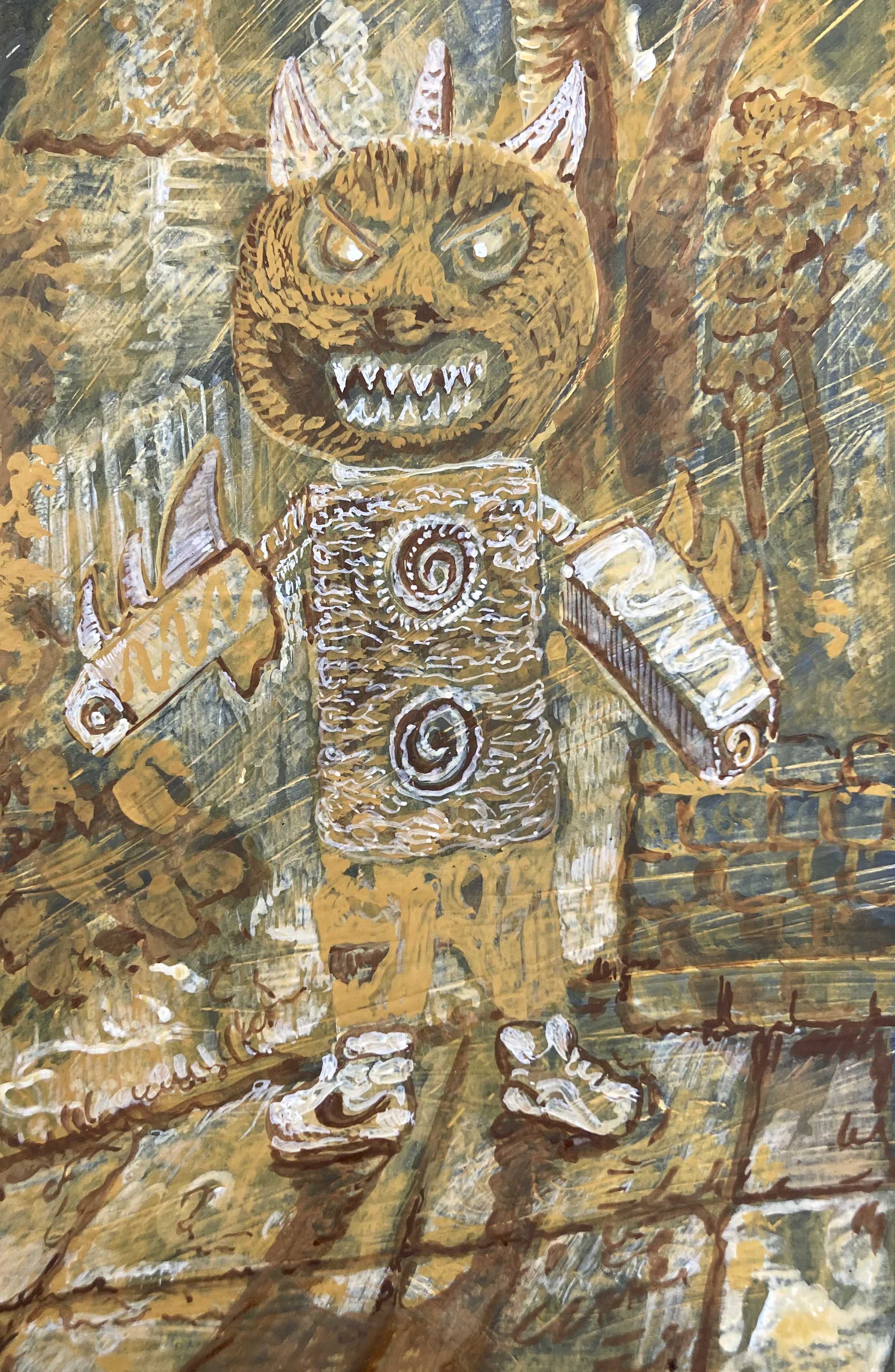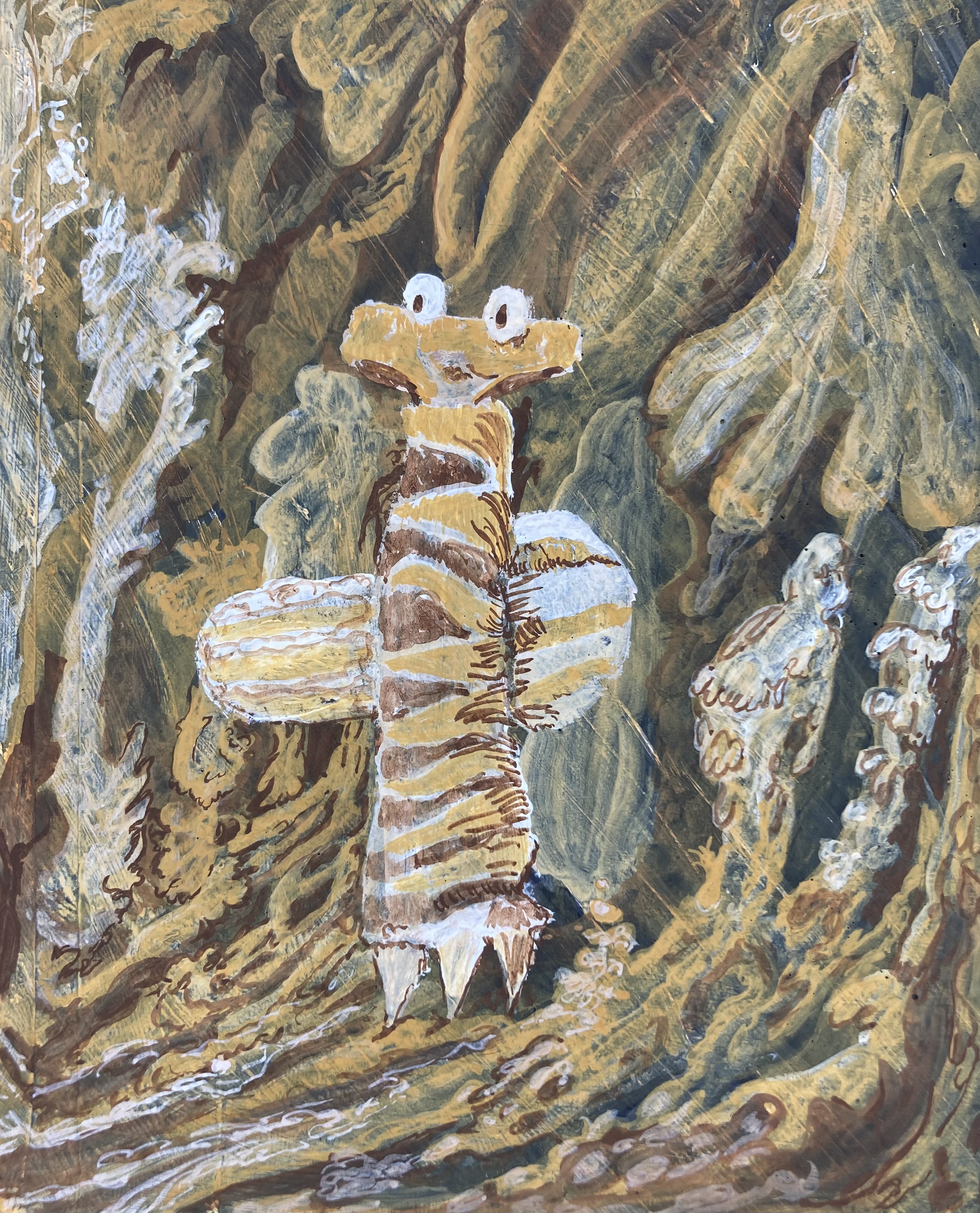 Painting as Shared Practice — From this archive, small paintings emerge. Created on recycled materials such as cardboard from consumer goods and scrap wood, each painting is prepared with layers of grey gesso and painted in tempera with a restricted palette. These paintings are not copies of the drawings, but translations — interpretations developed within a collective studio context. The process is standardized and open, allowing many hands to contribute.