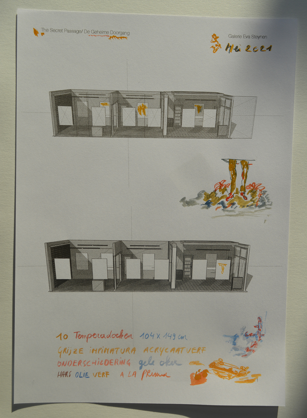 Voorstudie voor de galerie Eva Steynen Deviation(s) opstelling van de tentoonstelling ‘The Secret Passage’, 29,7cm x 21cm, gouache over laserinkt, 2021